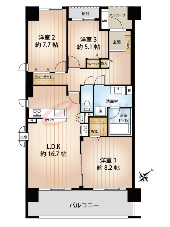 面積:専有 61.44㎡(壁芯)/バルコニー 14.61㎡